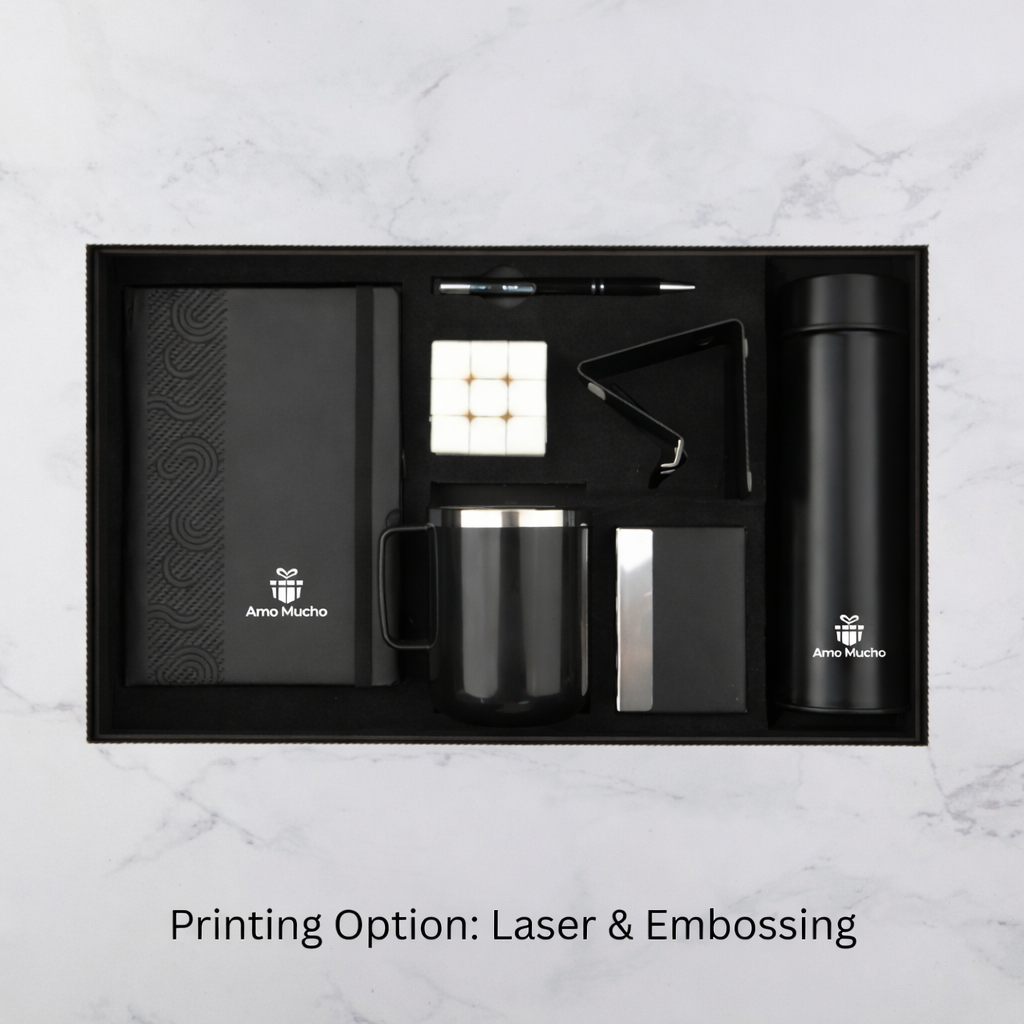 Black E Notebook Temperature Bottle Mug Mobile Stand Rubik Cube and Accessories Set (MOQ - 25)