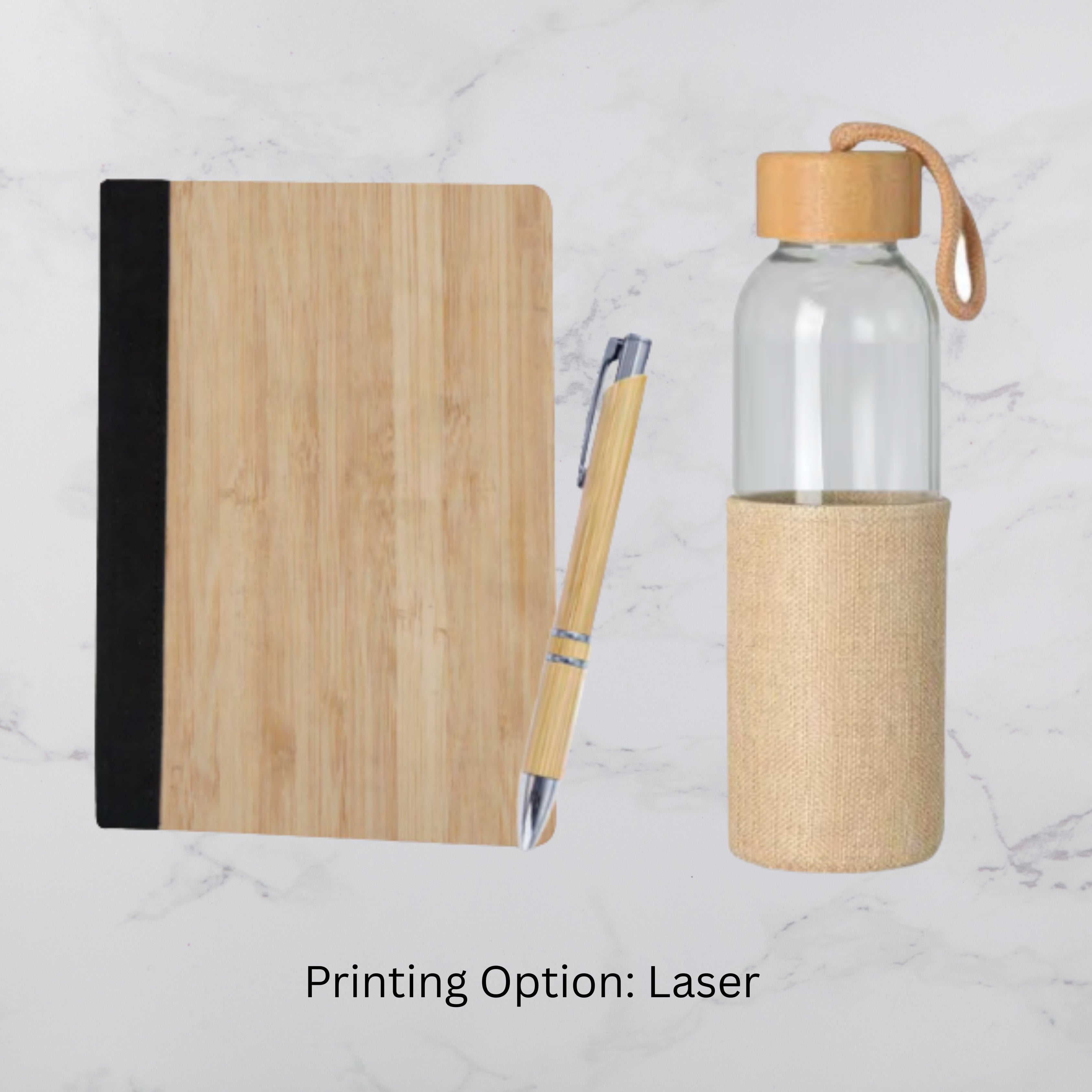 Plain Bamboo Design Notebook Glass Bottle and Ball Pen Gift Set (MOQ - 25)